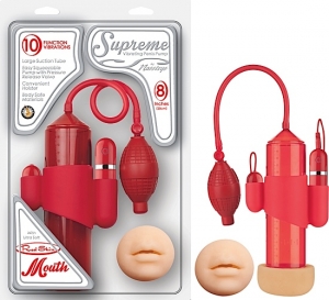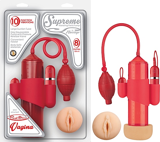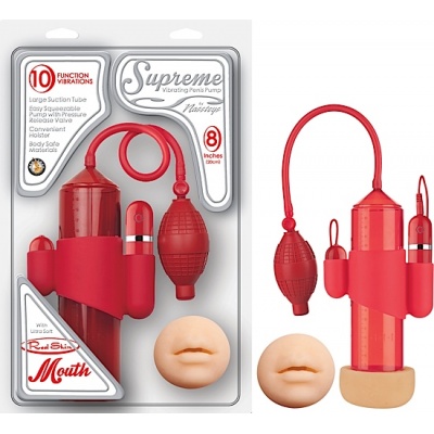 BOMBA DE SUCCION SUPREME, 10 DIFERENTES TIPOS DE VIBRACION, CON MASTURBADOR DE MATERIAL REAL SKIN EN LA PUNTA DEL CILINDRO, CON VALVULA DE LIBERACION DE PRESION, UTILIZA 3 BATERIAS AAA NO INCLUIDAS, EN COLOR ROJO, CON MASTURBADOR DE CIBERSKYN.