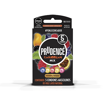 PRUDENCE CARIBBEAN, CONDON MASCULINO DE LATEX, LUBRICADO CON SILICON, SABORES TUTTI FRUTTTI, MORA, MARACUYA, FRANBUESA, MANGO, PRESENTACION CAJA CON 5 UNIDADES.