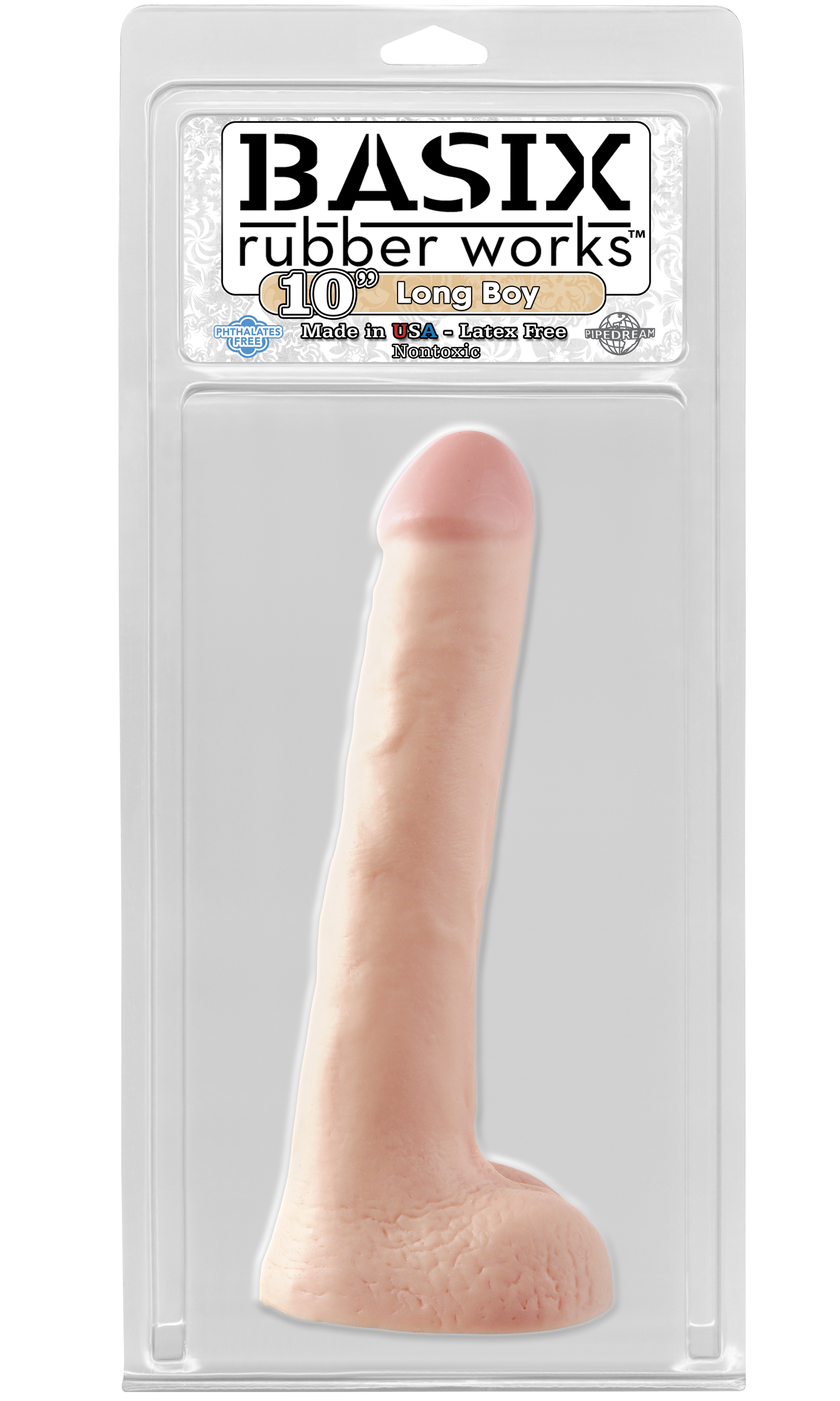 BASIX RUBBER WORKS 10" LONG BOY, DILDO REALISTIC, TERMINADO A DETALLE, BASE CON TESTICULOS, FLEXIBLE.