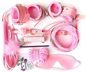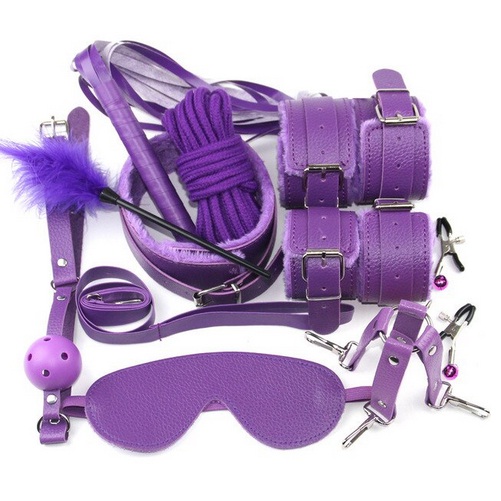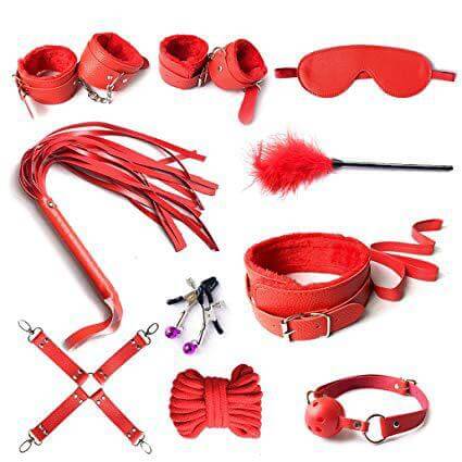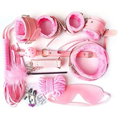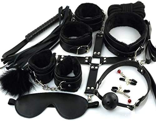 Esposas, esposas para pies. pezoneras, collar con correa, mordaza, paleta, látigo, antifaz, cuerda y tickler.